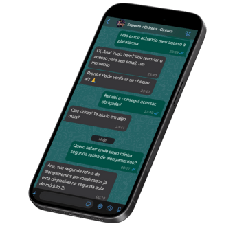 Durante todo o seu acesso ao +Glúteos -Cintura, você receberá ajuda diretamente pela minha equipe através de um número exclusivo no WhatsApp.